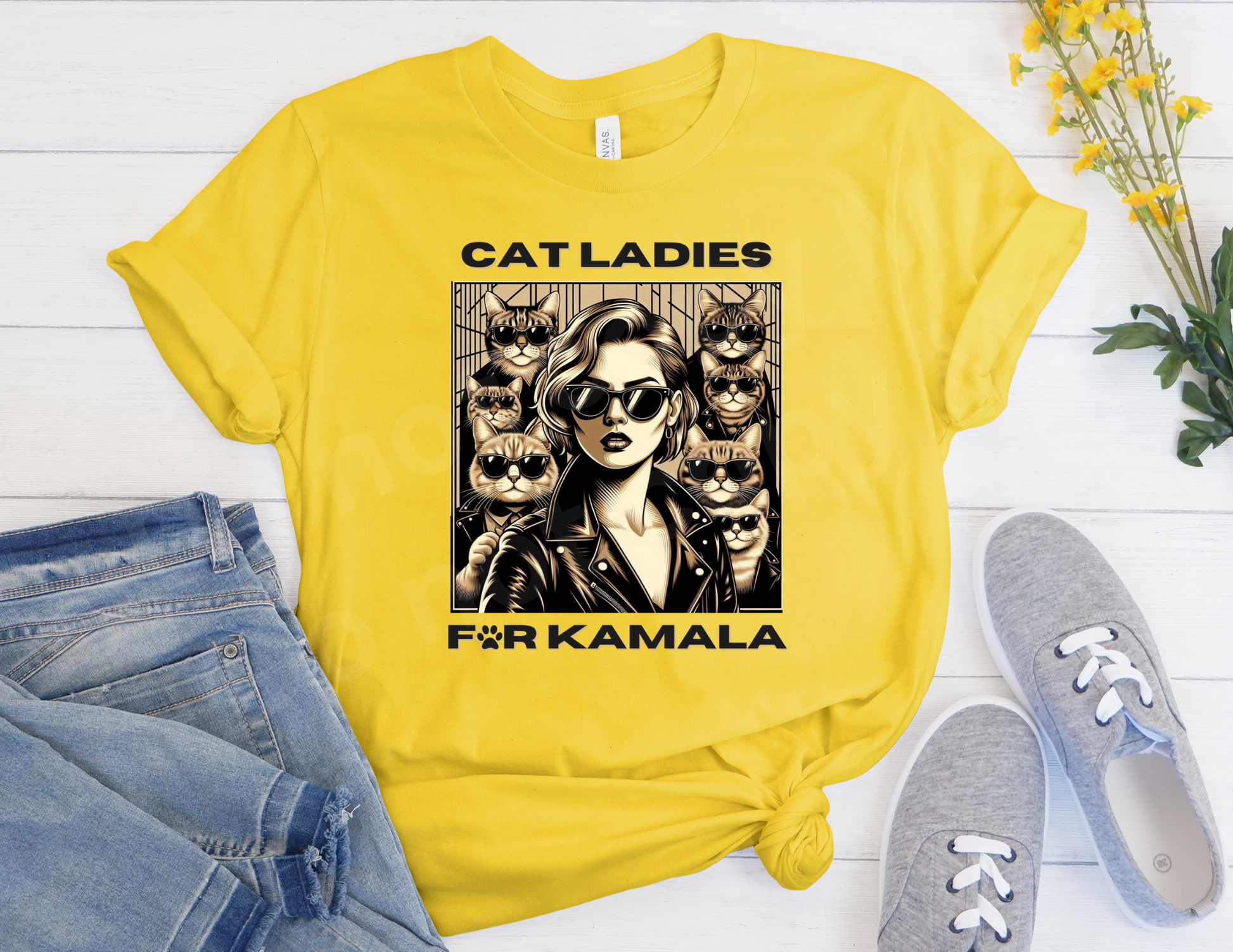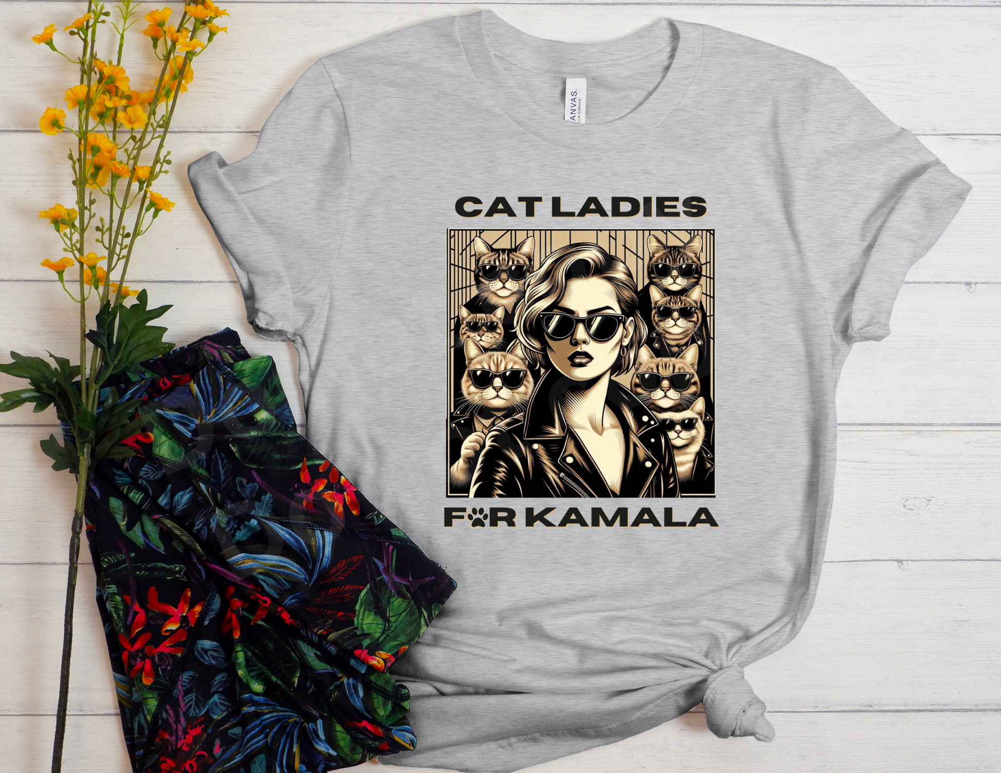 Embrace your inner baddie with our exclusive Cat Ladies for Kamala T shirt. Featuring a fierce cat gang and elegant black letters, this shirt is a must-have for any fashion-forward woman. Own your power and style with this statement piece.