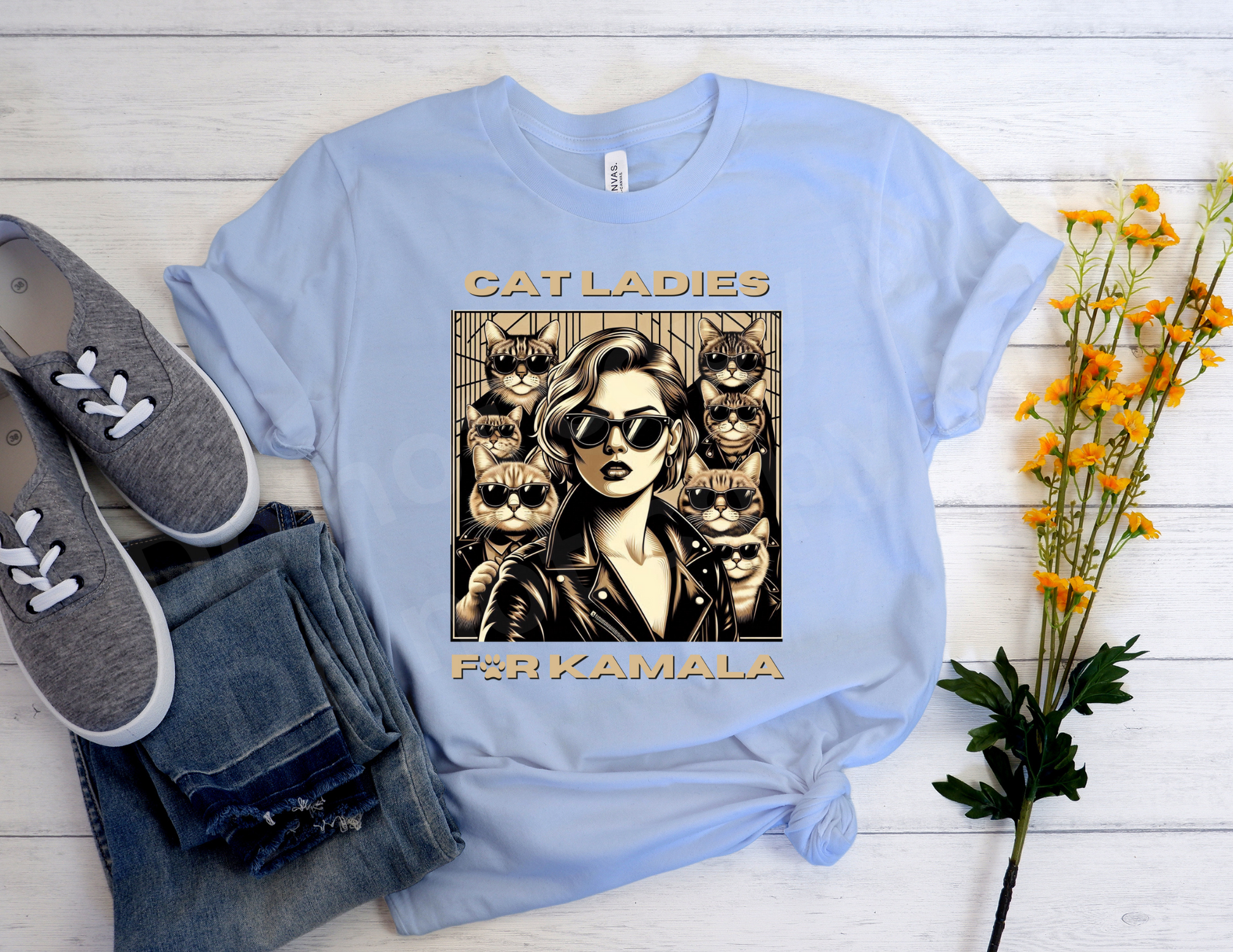 Embrace your inner baddie with our exclusive Cat Ladies for Kamala T shirt. Featuring a fierce cat gang and elegant cream letters, this shirt is a must-have for any fashion-forward woman. Own your power and style with this statement piece.