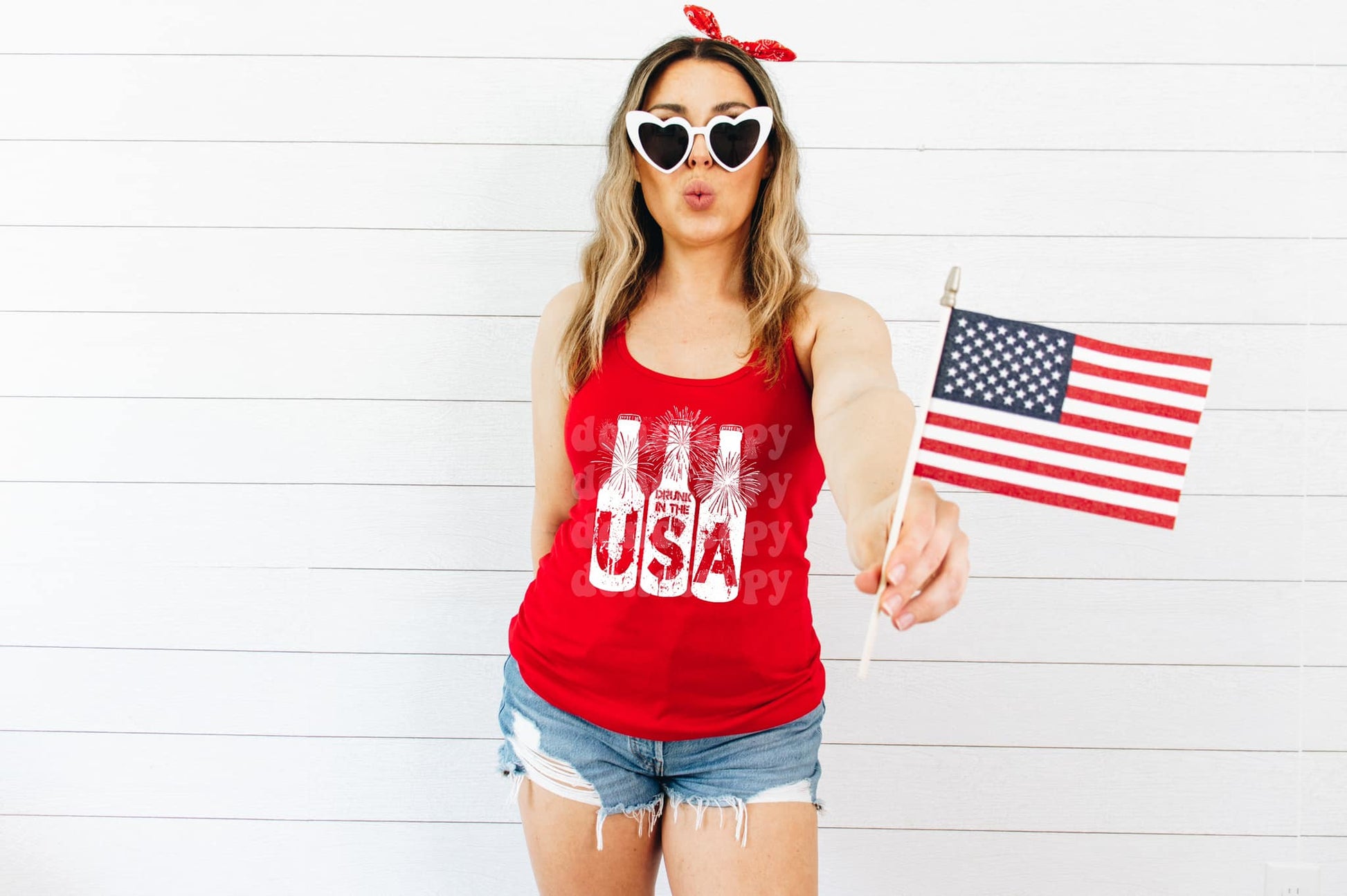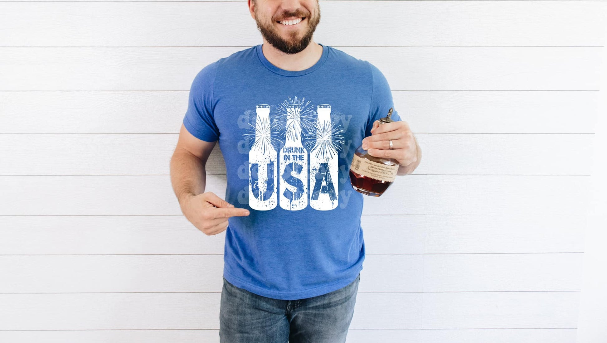 Show off your love for the USA and your favorite pastime with this Drunk in the USA t-shirt! Sport your patriotism and make a statement with this stylish and comfy shirt. Its classic fit and bold text will ensure you stand out from the crowd. Get lit in the USA and rock this shirt! 🤘