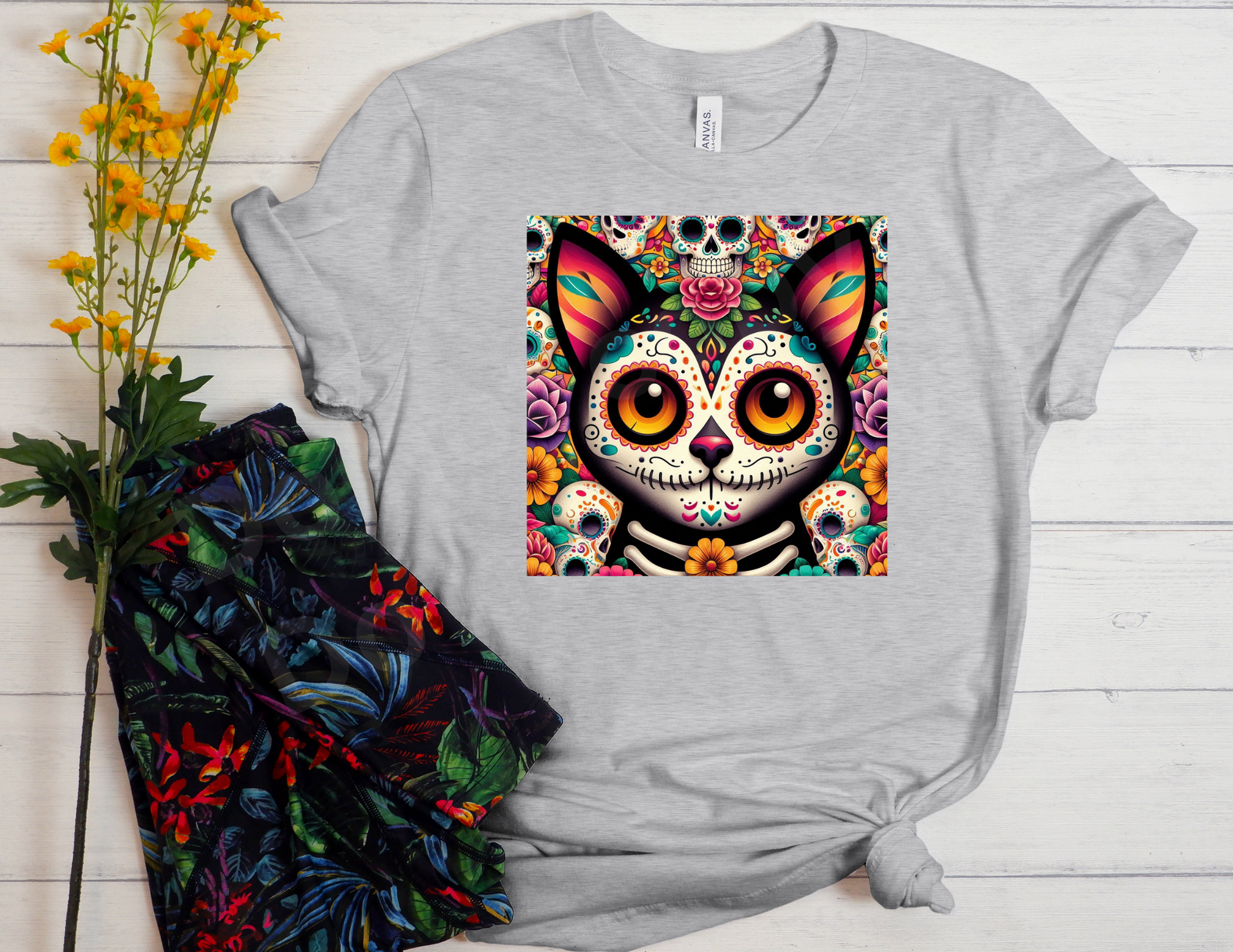 Embrace the spooky season with our Cat Sugar Skull T-shirt! Featuring a colorful and unique design, this shirt is perfect for Halloween parties. Stand out in style and show off your love for all things feline (and creepy)!