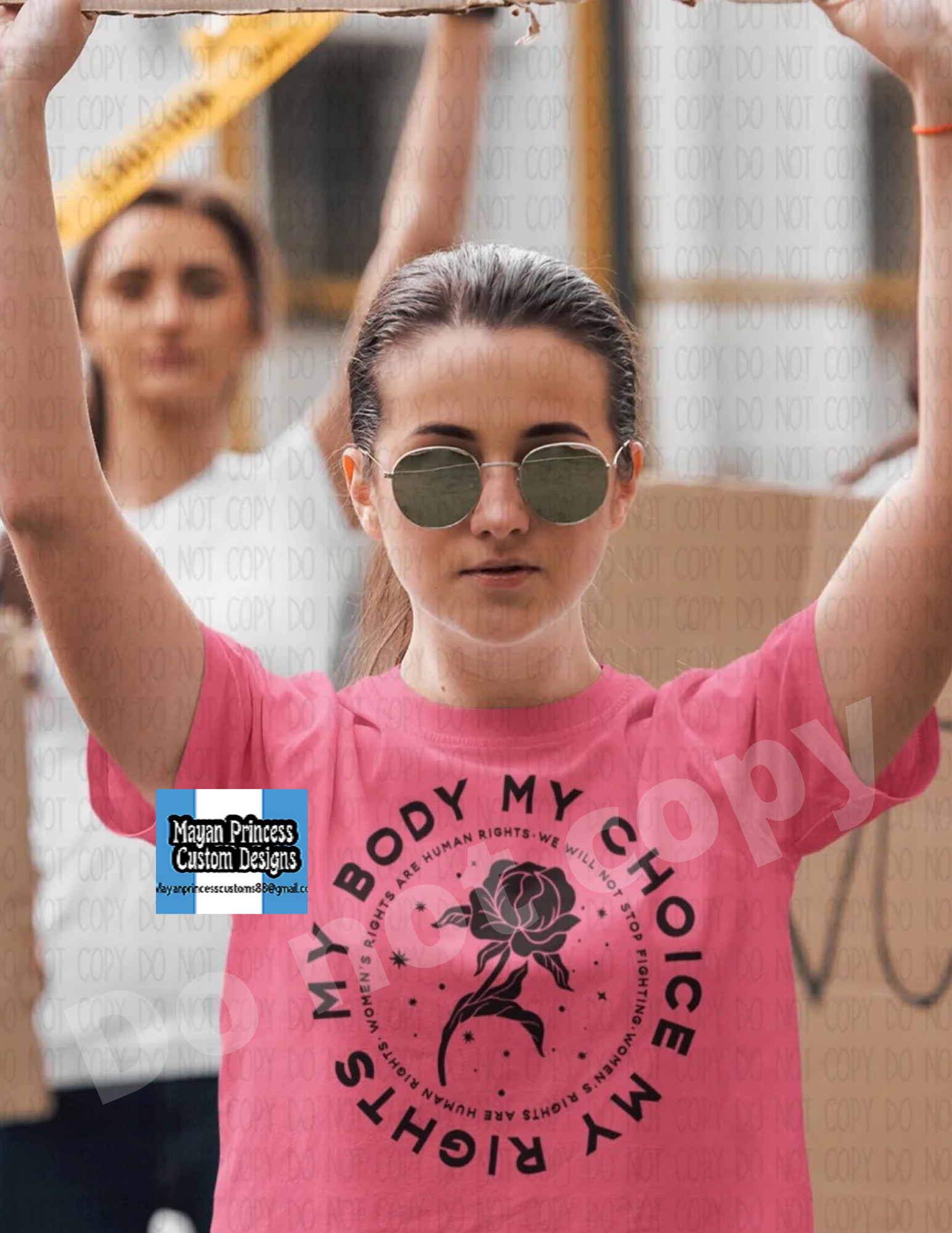 Show your support for women's rights with this stylish 'My body my choice' t-shirt! It's made of high-quality material for a comfortable fit and features a modern, minimalistic design that will help you make a strong statement without saying a word.