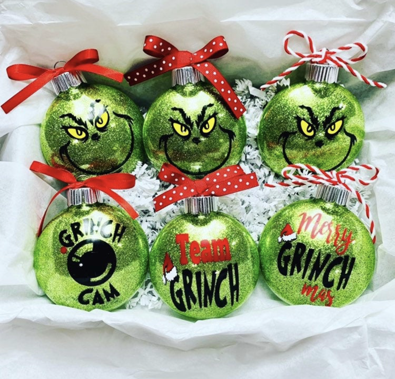 Grinch ornaments are made on 4-inch flat disc ornaments.