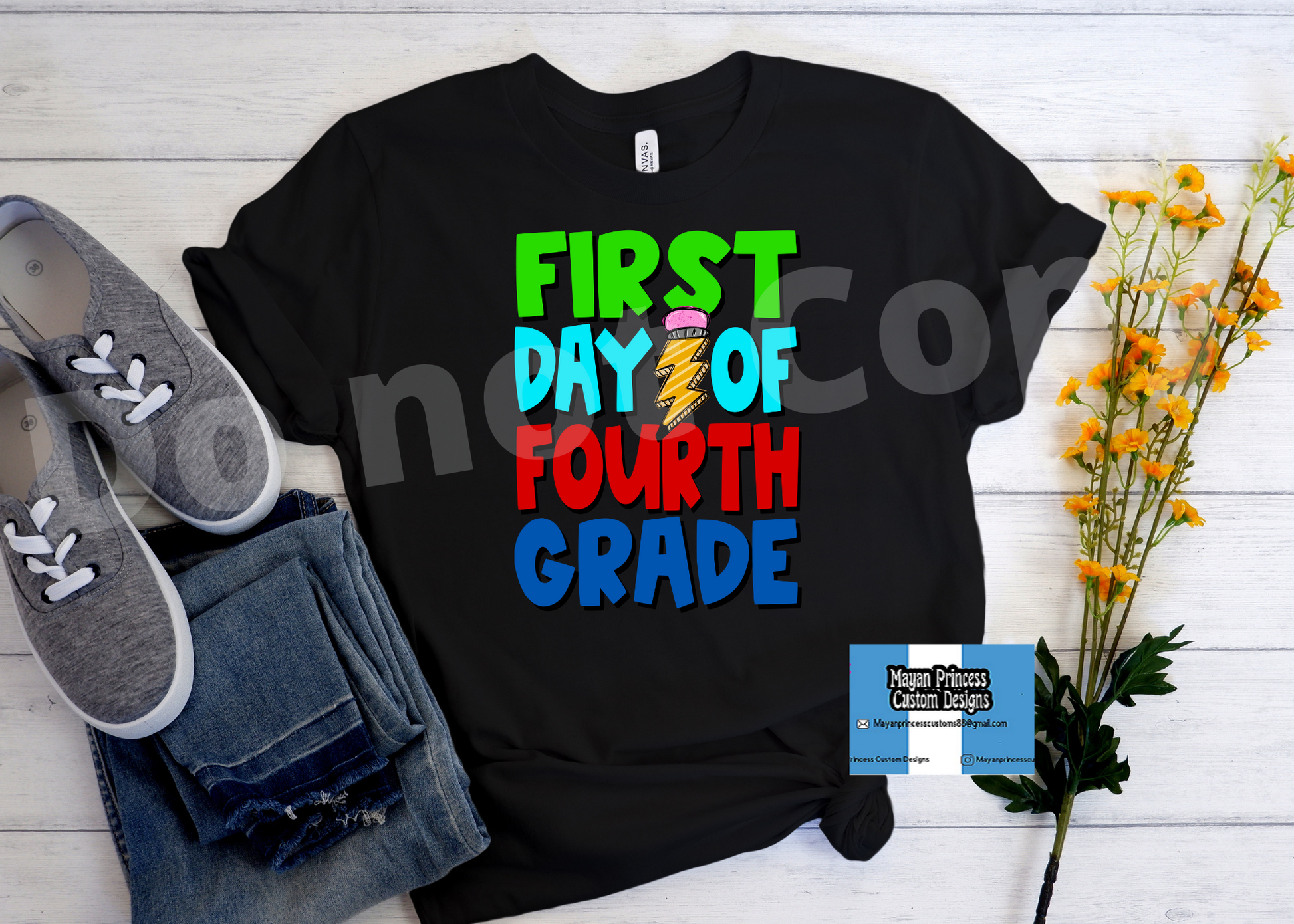 Celebrate the start of 4th grade with our special edition youth T-shirt! Perfect for making a statement on the first day of school, this quality design features a bold "First Day of 4th Grade" message. A must-have for any budding student.