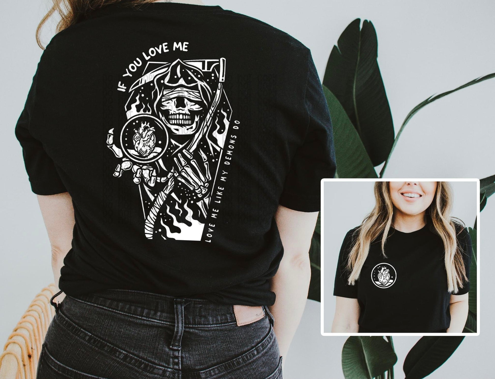 Unleash your inner rebel with this "Love me like demons do" T-shirt. Make a bold statement and stand out from the crowd with this unique design. Conquer the day with daring styling and complete your look with a daring attitude.