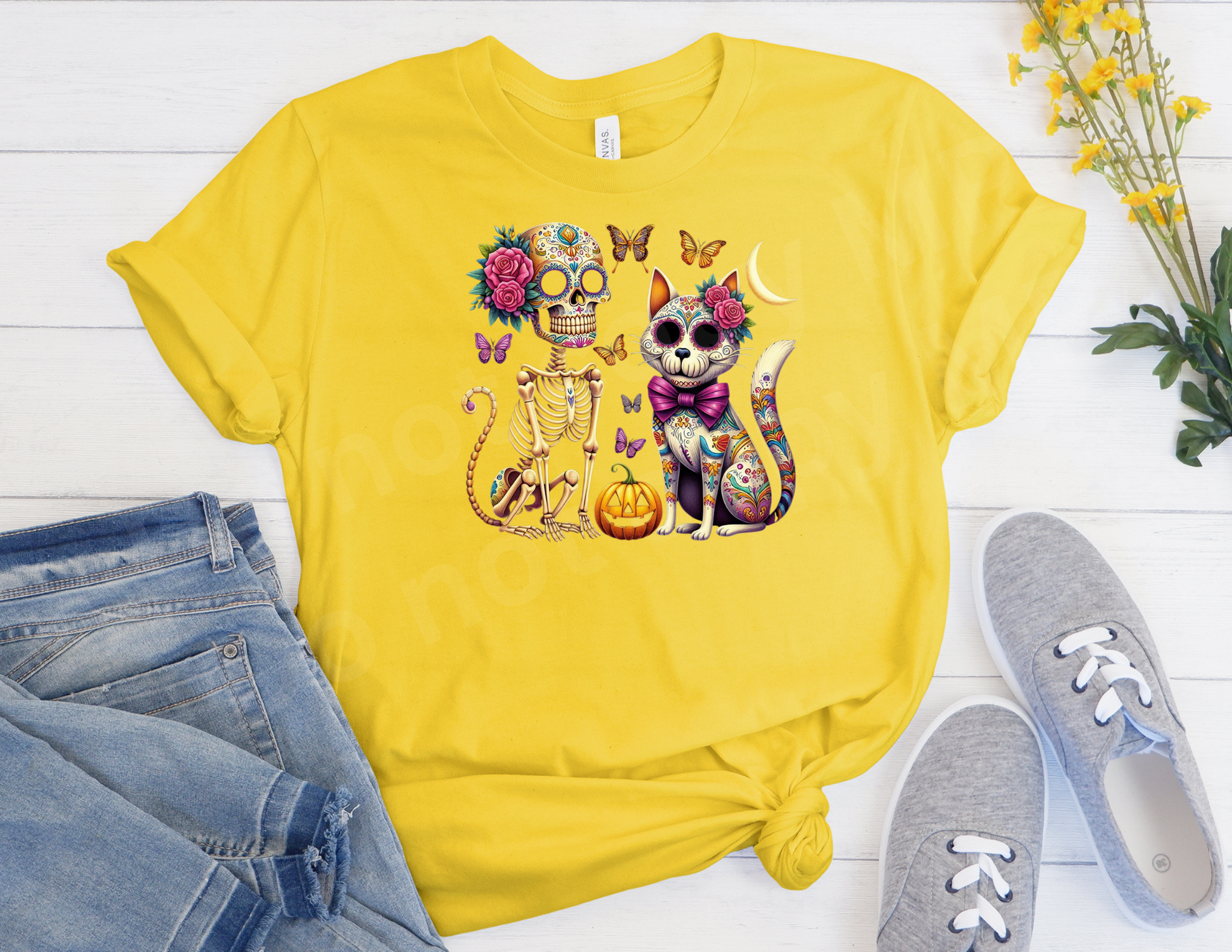 Unleash your Halloween spirit with our Cat and Dog Sugar Skull T-shirt! This playful design features a unique sugar skull twist on the classic cat and dog duo. Perfect for those who don't take themselves too seriously and love a good pun. (Limited edition for the day of the dead!)