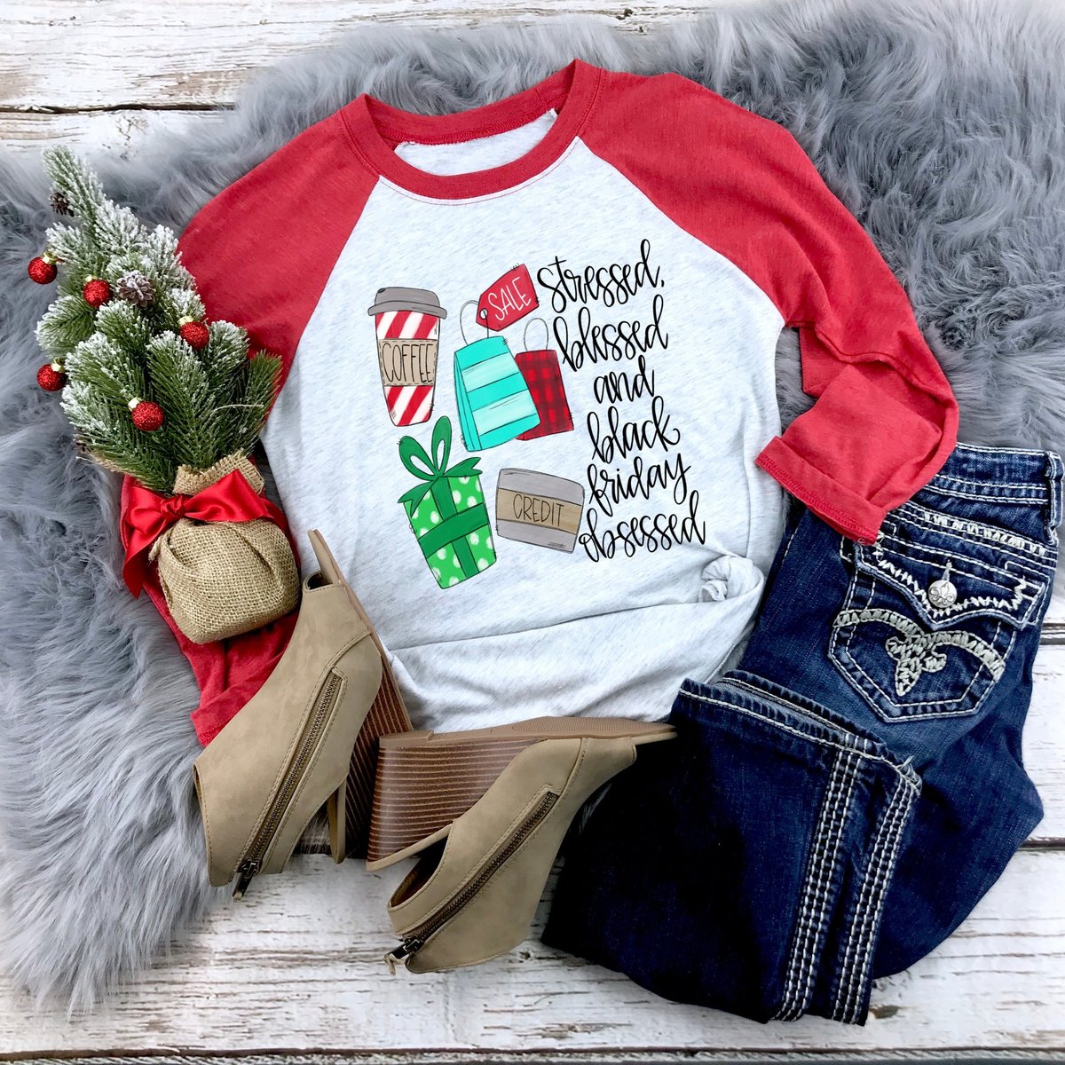 Take the stress of a Black Friday shopping spree out of your wardrobe and add some humor instead with this "Stress Blessed and Black Friday Obsessed" t-shirt. With its all-black design and quirky message, it's sure to stand out in any crowd! 🤩